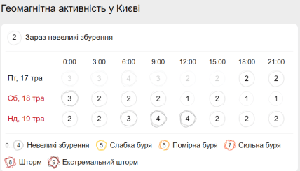 Об этом говорится на портале Meteofor. Так, в пятницу, 17 мая, в столице ожидается уровень геомагнитной активности 2.