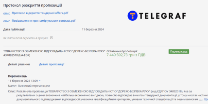 Тендерное предложение опубликовано на сайте публичных закупок Prozorro. Аукцион завершен и избран победитель.