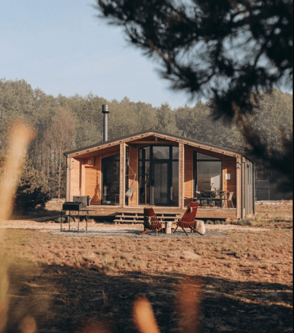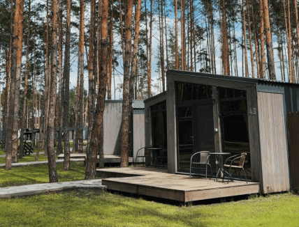 - мини-кабинки среди леса. Это небольшие мобильные домики на 1-2 человека площадью до 15 кв.м. с панорамным окном и мини-кухней. У каждого из них оборудована зона отдыха с мангалом.