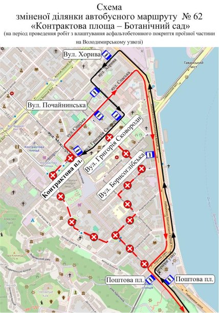 Общественный транспорт будет курсировать по следующей схеме: от Ботанического сада до Владимирского спуска по действующему маршруту, дальше – Боричев спуск – ул. Набережно-Крещатицкая – ул. Хорива – ул. Почайнинская – ул. Григория Сковороды – Контрактовая площадь, в обратном направлении – ул. Межигорская – ул. Спасская – ул. Набережно-Крещатицкая – Боричев спуск – Владимирский спуск, далее по действующему маршруту в Ботанический сад.