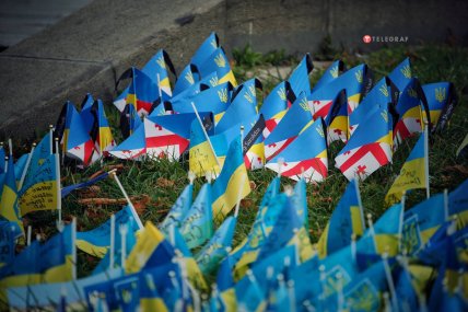 Кроме сине-желтых появились белорусские и грузинские флаги с именами иностранцев, которые погибли на войне сражаясь за нашу страну.