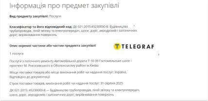 Речь идет об автодороге Т-10-39 Гостомельское шоссе – проспект Маршала Рокоссовского в Оболонском районе столицы. Это стало известно из объявления в электронной системе публичных закупок "Prozorro".