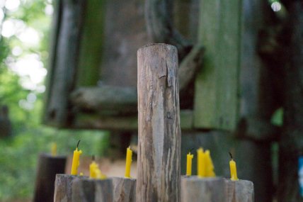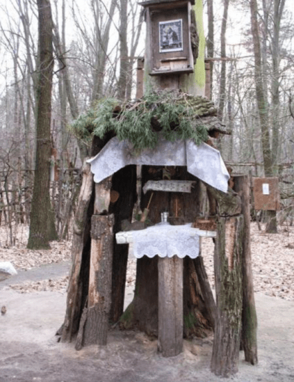 В самодельной келье, которая вырыта в земле, Сергий совершает молебны. Также здесь изредка можно увидеть записки с именами за здравие и упокой, которые оставляют "прихожане".