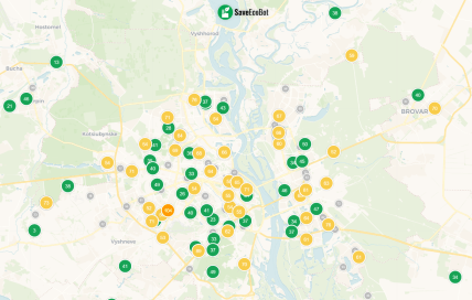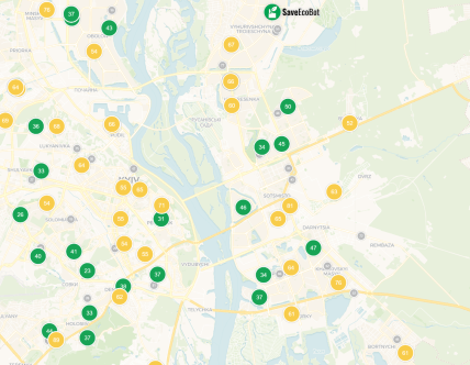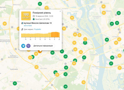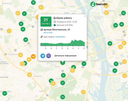 Лучший показатель с индексом 21 зафиксирован на улице Лисичанская в Соломенском районе. Также низкий уровень загрязнения на Чоколовке и в районе Караваевых дач.
