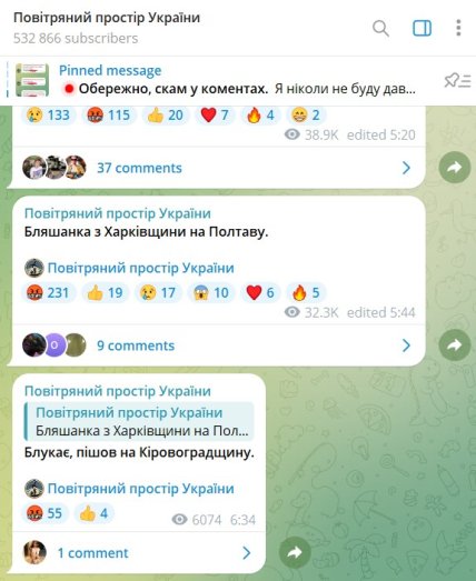 Одновременно с этим в Telegram существует ряд мониторинговых каналов, оперативно и точно извещающих о типах атак с воздуха и ориентировочных направлениях движения вражеских воздушных целей ("еРадар", "Воздушное пространство Украины", "Карта воздушных тревог", "ППО_Радар" и т.д.).