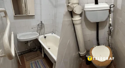 Квартира сохранила аутентичный вид советских времен. На фото видно, что в комнате есть кровать, старое кресло и шкаф. Пол полностью покрыт коврами. В ванной и туалете остался ремонт минувшей эпохи. Кухня хоть и с мебелью, но ремонт тоже еще советских времен.