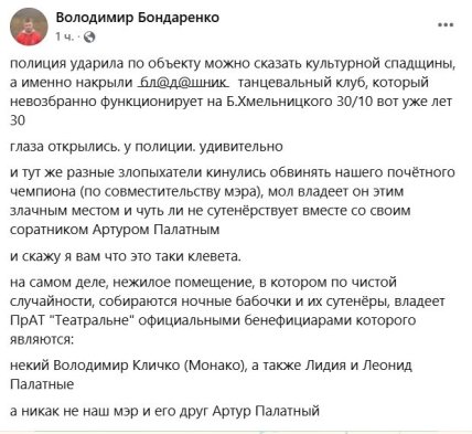 "Нежилое помещение, в котором по чистой случайности, собираются ночные бабочки и их сутенёры, владеет ПрАТ "Театральне" официальными бенефициарами которого являются: некий Володимир Кличко (Монако), а также Лидия и Леонид Палатные, а никак не наш мэр и его друг Артур Палатный", — написал он.