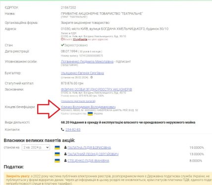 Здание на Богдана Хмельницкого 30 в Киеве, в котором злоумышленники организовали бордель, принадлежит ЧАО "Театральное". Конечным его бенефициаром является Владимир Кличко.