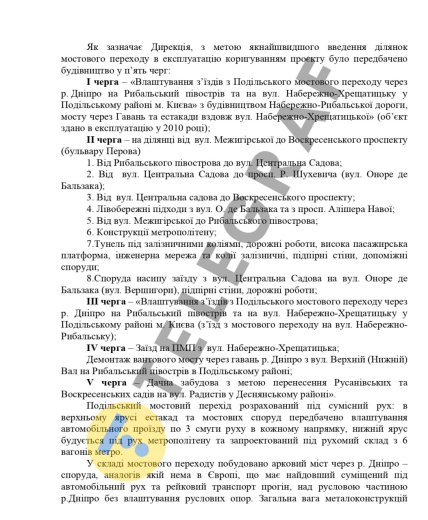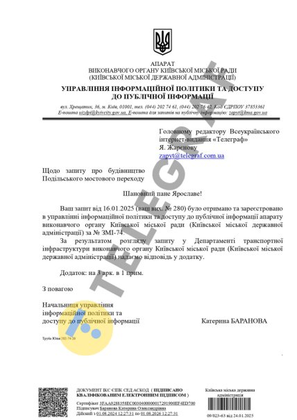 "По результатам обработки сообщаем. По информации КП "Дирекция строительство дорожно-транспортных сооружений г.Киева" (далее – Дирекция) по состоянию на 20.01.2025 Киевской городской прокуратурой г. Киева отозвано исковое заявление о признании недействительным договора генподряда на строительство объекта" Строительство Подольского мостового перехода через р. Днепр в г. Киеве", — говорится в ответе КГГА.