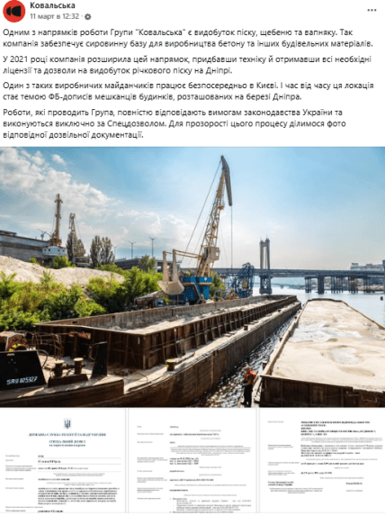 "В 2021 году компания расширила это направление, приобретя технику и получив все необходимые лицензии и разрешения на добычу речного песка на Днепре Одна из таких производственных площадок работает непосредственно в Киеве. И время от времени эта локация становится темой ФБ-сообщений жителей домов, расположенных на берегу Днепра". — говорится в сообщении.