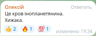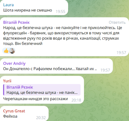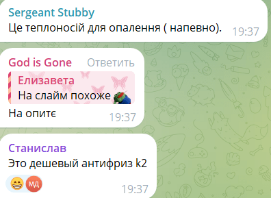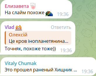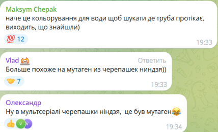 Автор публикации написал в комментарии: "Что это, моча Халка?" В ответ подписчики Telegram-канала начали сыпать шутками о том, что это кровь Хищника из одноименного фильма или другого инопланетянина. Также были варианты о мутагене из черепашек-ниндзя и дешевом антифризе К2. Кроме того, в обсуждении опубликовали изображение Шрека похожего цвета.
