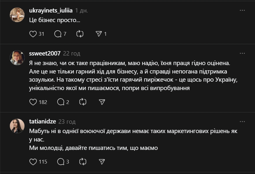 Этот эпизод сразу же вызвал бурное обсуждение среди украинцев. Одни восхищались изобретательностью и силой духа: "Меня уже мало что удивляет, но пекарня в метро во время баллистики — это высший пилотаж адаптации. Мы не просто выстоим. Мы еще будем с корицей".