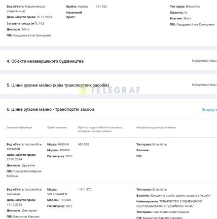 В целом семейство Бахматовых за 2024 год заработало около 6 миллионов гривен. Больше всего в семейный бюджет вложилась супруга Бахматова — 4 834 876 гривен.