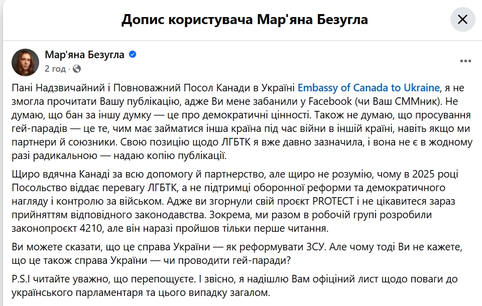 "Не думаю, что продвижение гей-парадов — это то, чем должна заниматься другая страна во время войны в другой стране, даже если мы партнеры и союзники. Свою позицию по ЛГБТК я уже давно отметила, и она ни в коем случае не радикальная — предоставляю копию публикации", — написала депутат.