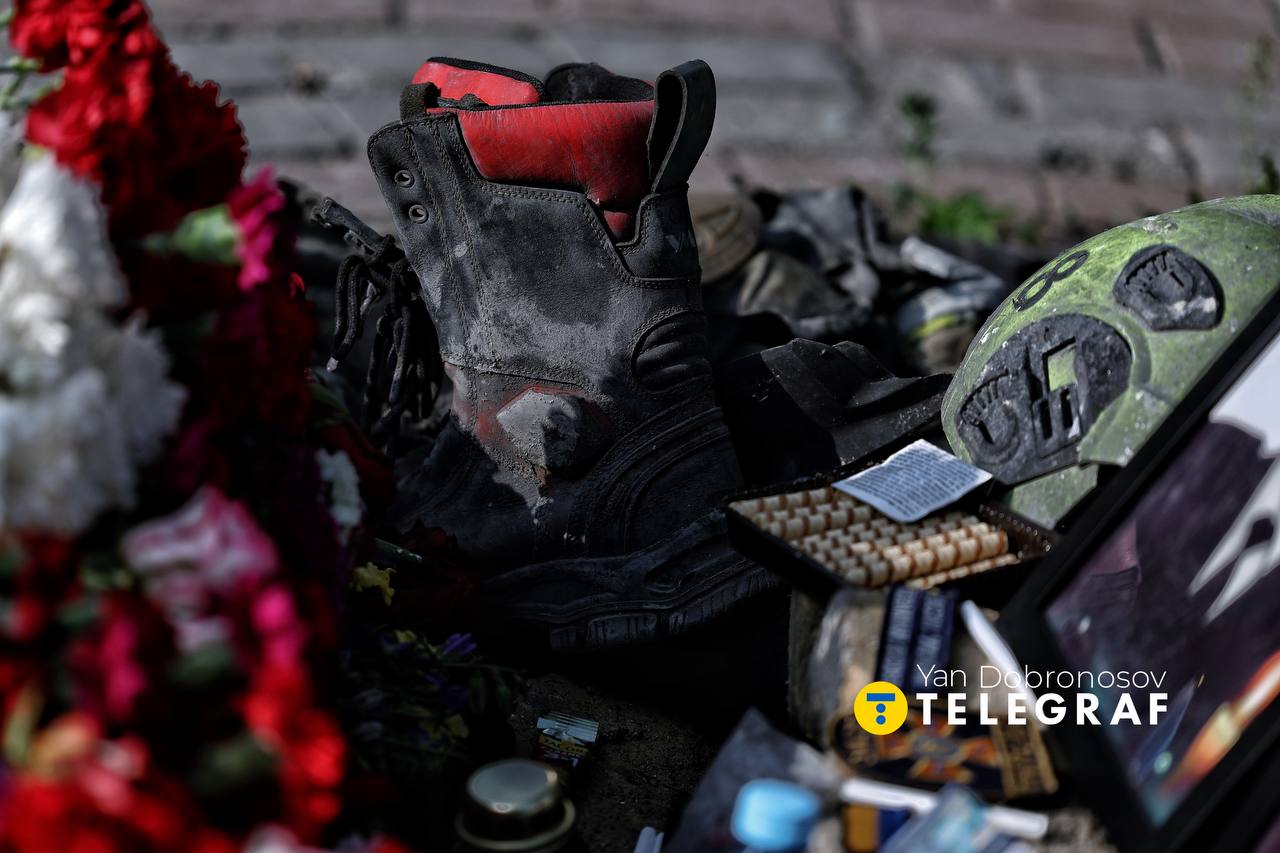 В результате российской атаки на Киев 6 июня погибли три спасателя ГСЧС: Павел Езгор, Данил Скадин и Андрей Ременный. Уже вторые сутки люди приходят на это место, чтобы почтить их память.