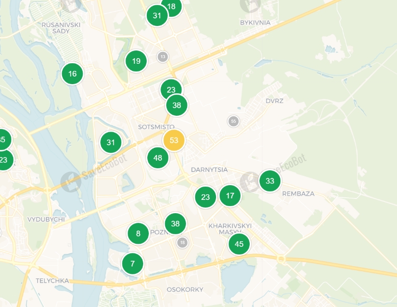 Однако "умеренный уровень" наблюдается в Днепровском районе, а именно на Харьковском шоссе. Там показатель загрязнения воздуха составил 53. Это может вызвать незначительный дискомфорт при дыхании у чувствительных людей.
