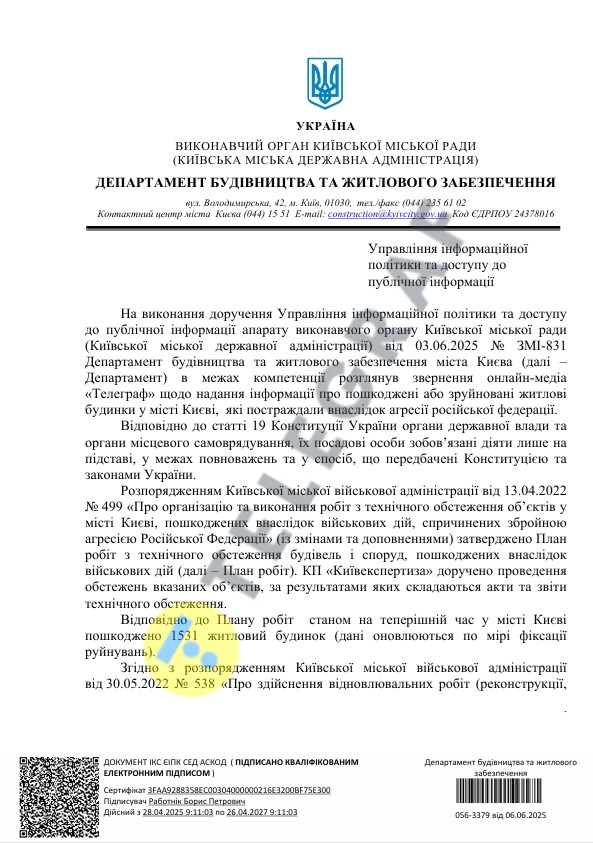 При этом, как рассказали "Телеграфу" в Департаменте строительства и жилищного обеспечения, согласно плану работ по состоянию на данный момент (запрос от 3 июня) в городе Киеве поврежден 1531 жилой дом (данные обновляются по мере фиксации разрушений).