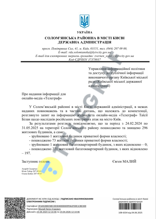 По состоянию на 31 мая, согласно данным, предоставленным "Телеграфу" Соломенской райадминистрацией, с начала полномасштабного вторжения в районе было повреждено 296 жилых домов, а именно: