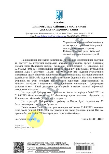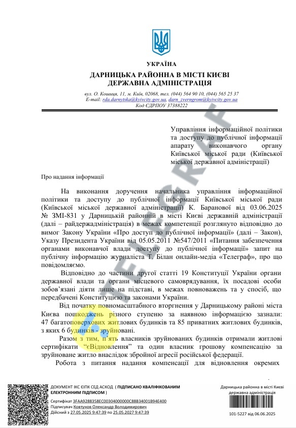 По состоянию на 3 июня, согласно данным, предоставленным "Телеграфу" Дарницкой райадминистрацией, с начала полномасштабного вторжения повреждения различной степени получили: