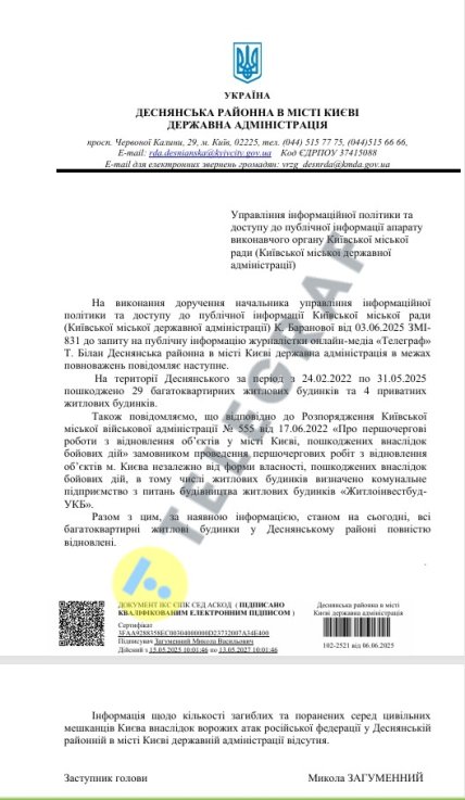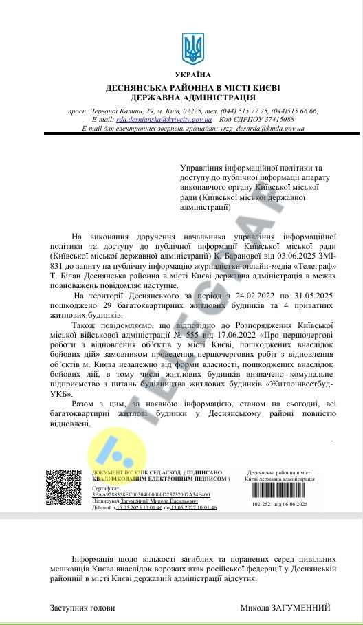 По состоянию на 31 мая, согласно данным, предоставленным "Телеграфу" Деснянской райадминистрацией, с начала полномасштабного вторжения в районе было повреждено: