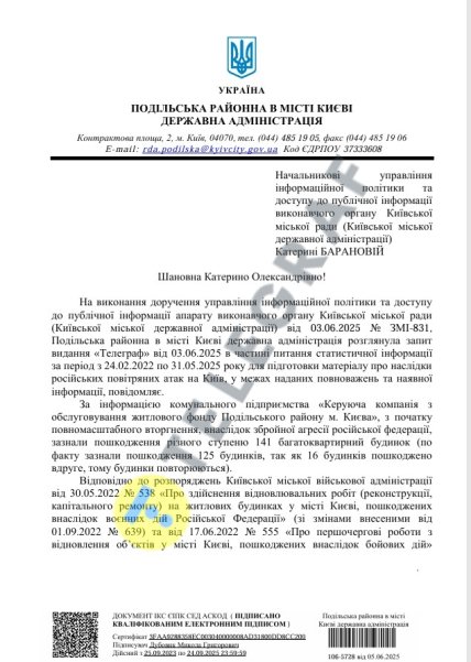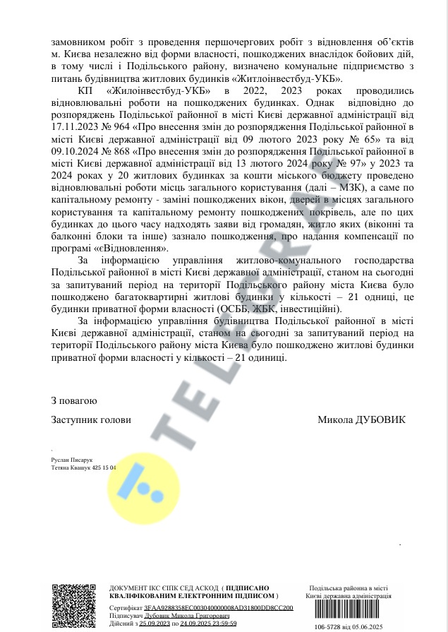 "КП "Жилоінвестбуд-УКБ" в 2022, 2023 годах проводились работы по восстановлению на поврежденных домах. Однако в соответствии с распоряжениями Подольской районной в городе Киеве государственной администрации в 2023 и в 2024 годах в 20 жилых домах за средства городского бюджета проведено восстановительные работы мест общего пользования, а именно по капитальному ремонту – замене поврежденных окон, дверей в местах общего пользования и капитальному ремонту поврежденных кровель, но по этим домам до сих пор поступают заявления от граждан, жилье которых (окна, балконные блоки и прочее) получило повреждение, о предоставлении компенсации по программе "єВідновлення", — говорится в ответе.