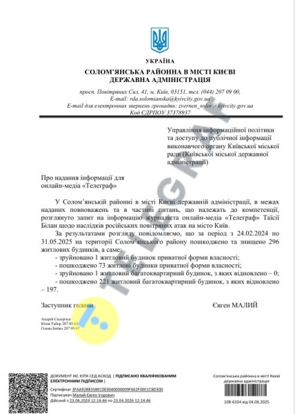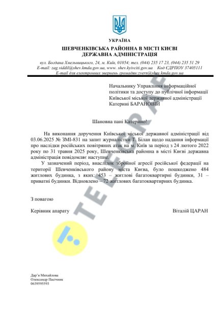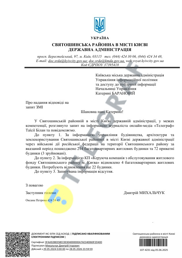 По состоянию на начало июня, согласно данным, предоставленным "Телеграфу" Святошинской райадминистрацией, с начала полномасштабного вторжения в районе было повреждено: