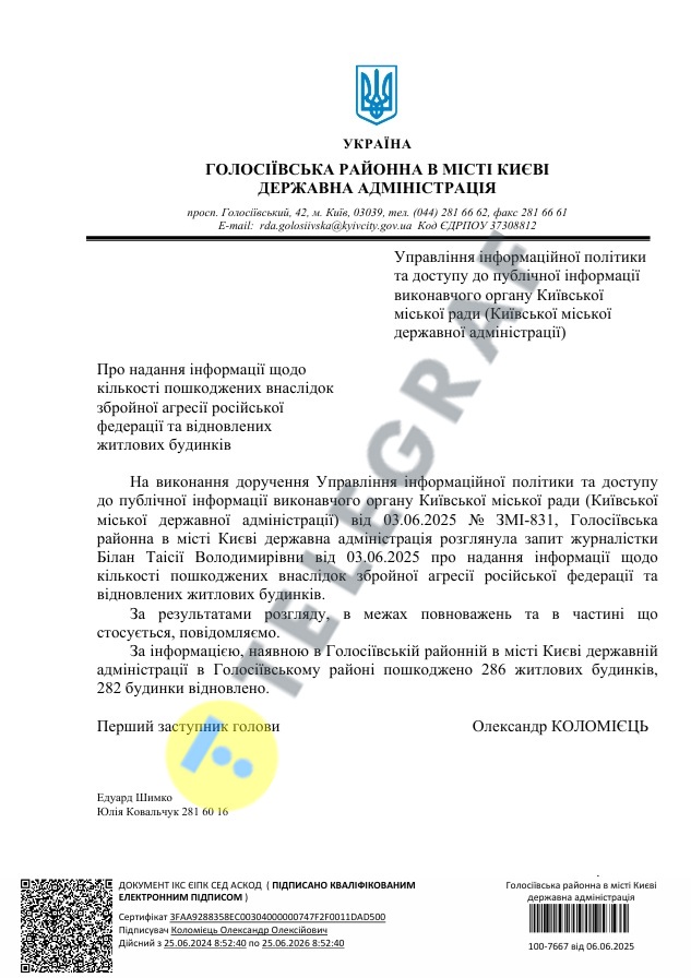 По состоянию на 3 июня, согласно данным, предоставленным "Телеграфу" Голосеевской райадминистрацией, с начала полномасштабного вторжения в районе было повреждено: