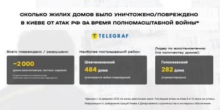 "Согласно распоряжению Киевской городской военной администрации от 30.05.2022 № 538 "Об осуществлении восстановительных работ (реконструкции, капитального ремонта) на жилых домах в городах Киеве, поврежденных в результате военных действий Российской Федерации" (с изменениями и дополнениями) определено 39 многоквартирных жилых домов, подвергшихся значительным повреждениям и восстанавливаются за счет средств бюджета Киева", — говорится в ответе.