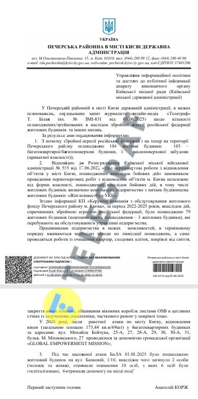 По состоянию на 3 июня, согласно данным, предоставленным "Телеграфу" Печерской райадминистрацией, с начала полномасштабного вторжения в районе было повреждено:
