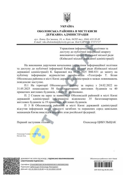 По состоянию на 31 мая, согласно данным, предоставленным "Телеграфу" Оболонской райадминистрацией, с начала полномасштабного вторжения в районе было повреждено: