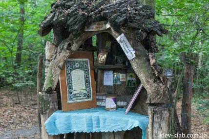 Этот храм еще в 1999 году обустроил киевлянин Сергей Борисов. Человек много лет собственноручно обустраивал пустынь в лесу — и со временем там появились кресты, палатки, пещеры и даже что-то похожее на кафедру.