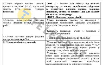 Второй лот предполагает закупку летних костюмов для мужских и женских сторожевых служб. Ожидаемая стоимость тендера – 11 140 718 гривен.
