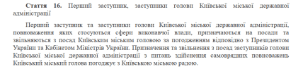 Согласно статье 16 Закона Украины "О столице Украины – городе-герое Киеве", первый заместитель и заместители главы Киевской городской государственной администрации, полномочия которых касаются исполнительной власти, назначаются и освобождаются от должностей Киевским городским головой по согласованию с Президентом Украины и Кабинетом Министров Украины.