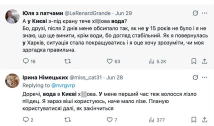 Пользователи соцсети X тоже говорят, что проблема с водой в столице системная, а из-за ее качества нередко бывают проблемы с выпадением волос или сыпью на лице.