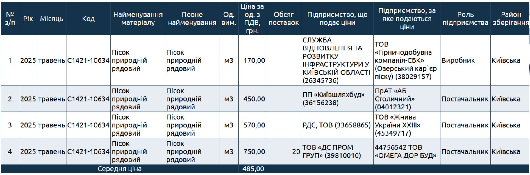 Шкиль отмечает, что цена ООО "Експрес-техбуд" в предложениях по продаже песка в системе Prozorro за период с марта по июнь 2025 составляет от 396 до 483 грн без НДС за тонну, в одном метре кубическом 1,5 тонны песка.