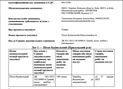 "Минимальная цена продажи песка ООО "Експрес-техбуд" в соответствии с данными из Прозоро составляет 594 грн без НДС за куб.м. (712,8 грн с НДС за куб.м).