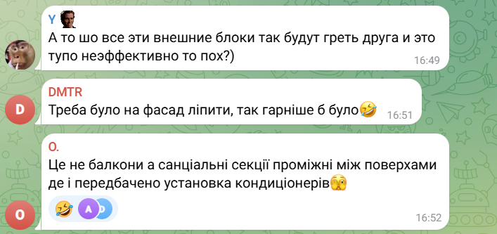 Во время прогулки в Киеве, на Оболони, мужчина обратил внимание на необычное архитектурное решение одной из новостроек — на каждом этаже, на каждом общем балконе размещено несколько внешних блоков кондиционеров. Его реакция была достаточно эмоциональной: он добавил, что впервые видит подобное.