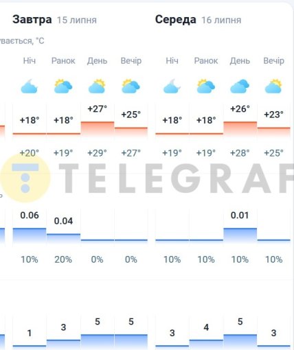 Температура в течение 15-16 июля днем может достичь максимальных +27…28 градусов, сообщили в Украинском гидрометеорологическом центре и в Погода.Мета. Об этом передает "Телеграф".