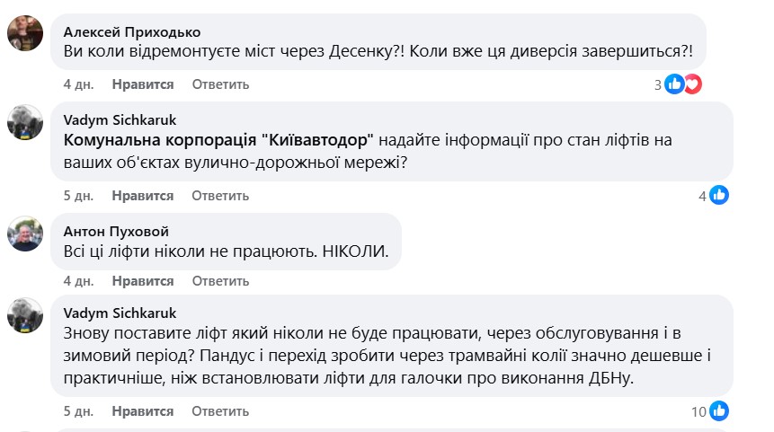 - Отметим, что при выполнении таких работ не предусматривается изменение характеристик сооружения или выполнение нового строительства, в частности, в части обустройства лифтов/подъемников или пандусов… На сегодняшний день предприятием "Киевавтошляхмист" рассматривается возможность устройства на сооружении средств беспрепятственного доступа лиц с инвалидностью и других маломобильных групп населения, а именно лифтов/подъемников или нормативных пандусов в рамках нового проекта. Реализация нового проекта с учетом требований ДБН В.2.2-40-2018 "Инклюзивность зданий и сооружений" возможна по завершении противоаварийных работ, – подчеркнули в "Киевавтодоре".