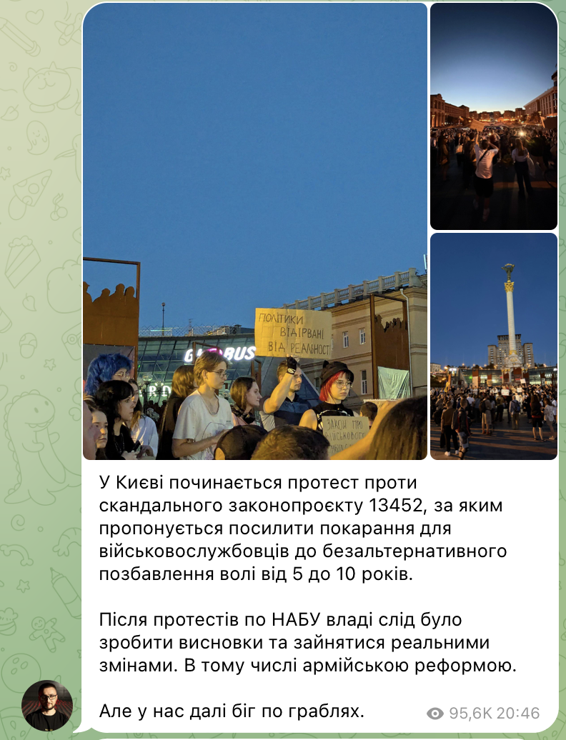 В Киеве на Майдане Независимости начался митинг против законопроекта 13452, который усиливается наказание для военных за неповиновение. На улицы столицы вышли более сотни людей, требующих справедливости.
