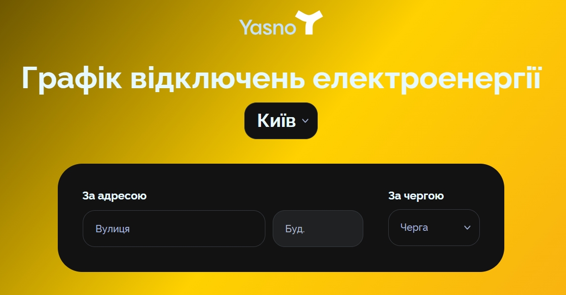Компания Yasno также дает киевлянам возможность просматривать графики отключения света через свой веб-ресурс. Интерфейс похож на сайт ДТЭК, но имеет некоторые отличия в отображении информации.