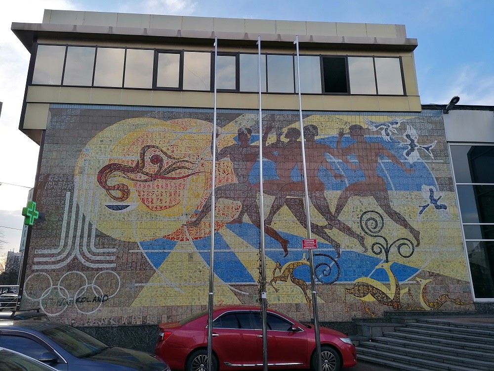 Мозаика, посвященная Олимпиаде на стене здания по адресу Дарницкий бульвар, 5