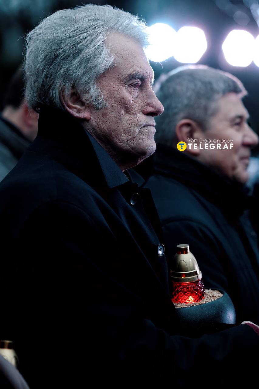 На фото видно, что почтить память жертв геноцида пришло много украинцев. Все зажигали свечи и стояли в тихой скорби у мемориала. К мероприятию также присоединились Ющенко и легенды киевского "Динамо" Алексей Михайличенко и Леонид Буряк.