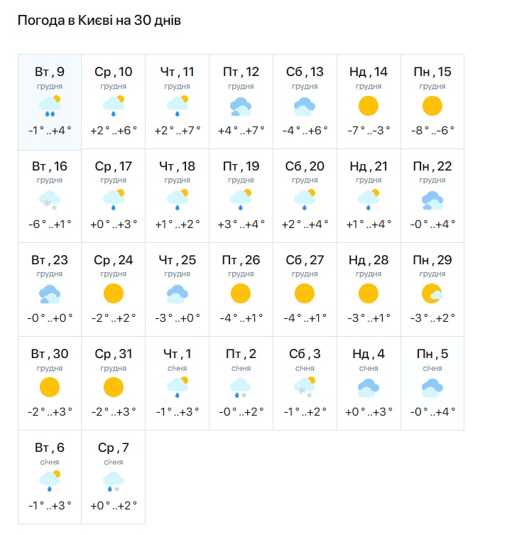 Того же мнения придерживаются и коллеги синоптиков с сайта meteo.ua. Они также прогнозируют снег 16 декабря. Однако, по их мнению, на следующий день он сменится небольшим дождем, который будет идти почти целую неделю. Температура воздуха на протяжении месяца, по этому прогнозу, будет колебаться на уровне -6+3 градусов.