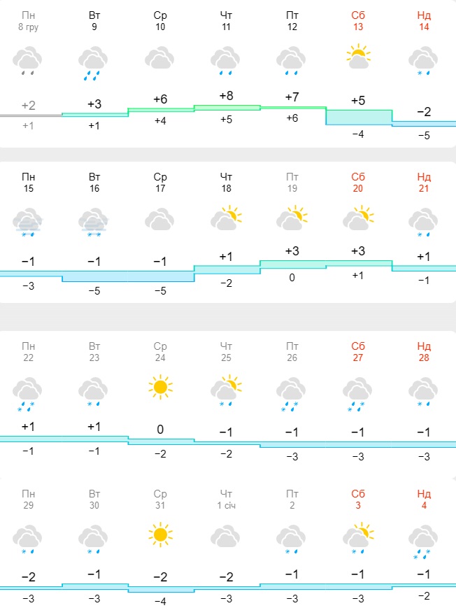 Украинский синоптик Игорь Кибальчич ранее в интервью "Телеграфу" рассказал, что в Украине первая декада декабря пройдёт в условиях мягкой и весьма спокойной погоды, с небольшим количеством осадков и слабым ветром. Температура воздуха будет стабильно выше нормы и практически во всех регионах страны превысит отметку 0 °С. Поэтому в ближайшей перспективе жителям нашей страны не стоит ожидать наступления метеорологической зимы (то есть, периода с устойчивыми морозами). В ночное время будут наблюдаться небольшие морозы, однако среднесуточная температура окажется "плюсовой".