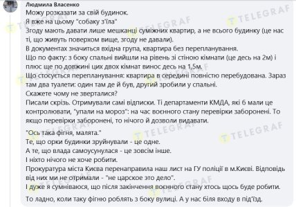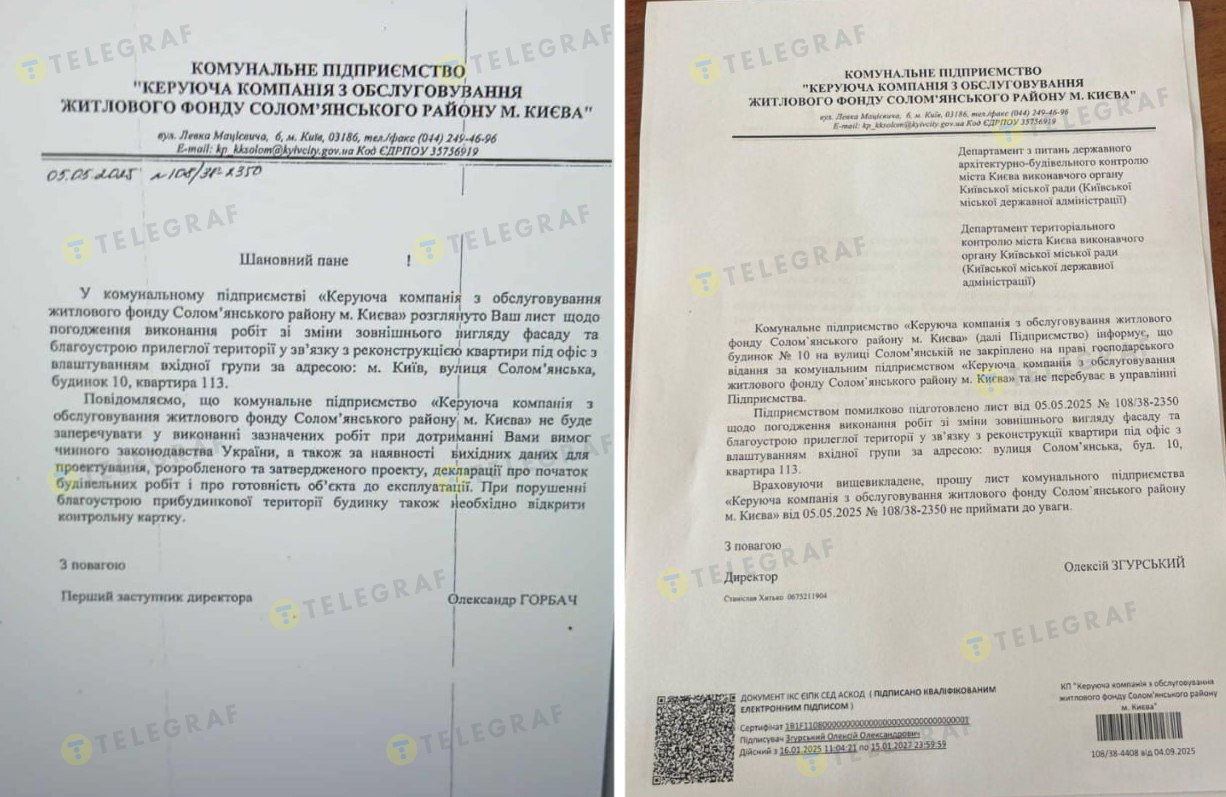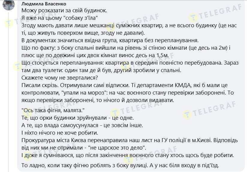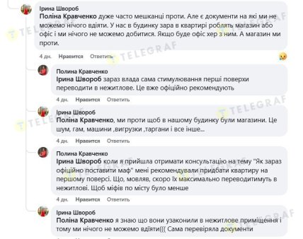 – Летом этого года в квартире прямо под моей начался ремонт, а его исполнители рассказали, что здесь будет ресторан или кафе. Мы были удивлены, ведь на собрании ЖСК "Будивельник-2" решали, что на первых этажах не будет никакой коммерции. Когда начали выяснять, писать запросы, оказалось: согласование предоставила Управляющая компания по обслуживанию жилого фонда Соломенского района. Хотя она не имеет никакого отношения к нашему дому. То есть это можно расценивать как подлог документов, – говорит в разговоре с "Телеграфом" Анна Колтышева.