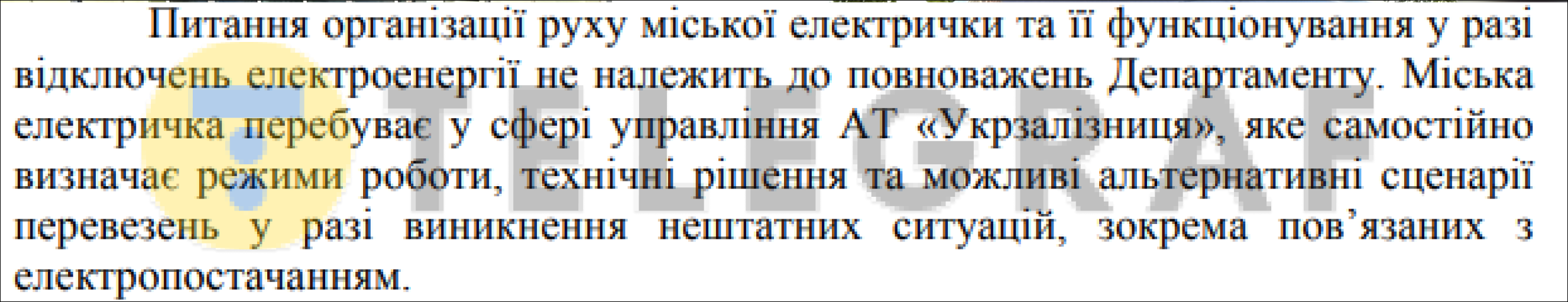 В Департаменте транспортной инфраструктуры КГГА в ответ на запрос "Телеграфа" сообщили, что в КП "Киевпастранс" разработаны меры на случай чрезвычайных ситуаций, связанных с отключением электроэнергии и остановкой работы электротранспорта.