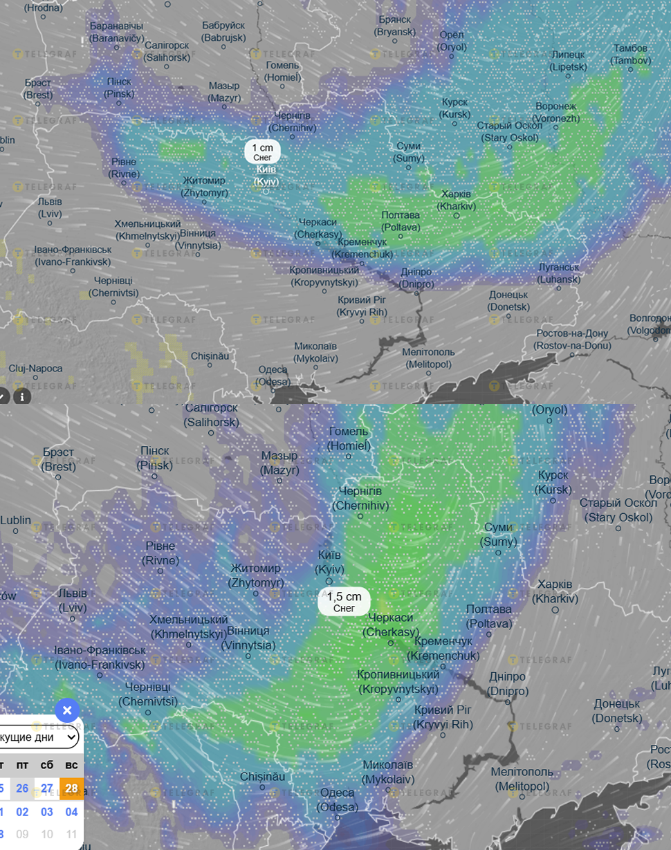 Снег в Киеве 26 и 28 декабря, карта атмосферного фронта