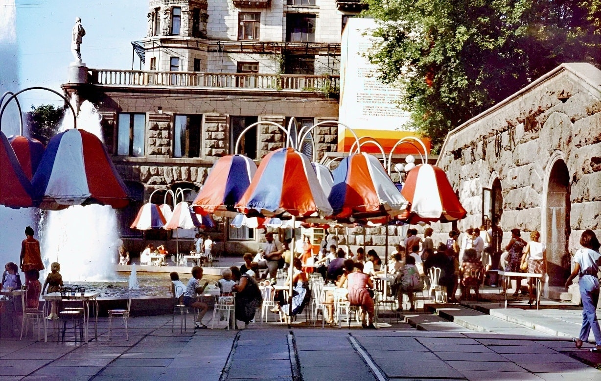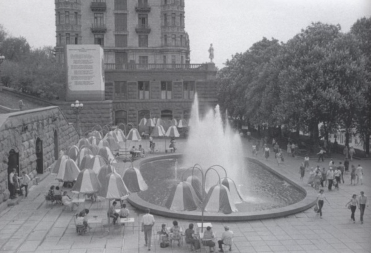 В Киеве на Крещатике было немало известных и уникальных заведений, к которым можно также отнести и кафе "Грот". Его особенностью были яркие американские зонтики, не оставлявшие равнодушными киевлян.