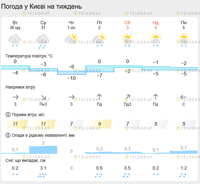 В последний день года 31 декабря будет сыпать снег. Температура будет держаться ниже нуля: днем до -6, ночью -8 градусов. Первый день года, согласно прогнозу Укргидрометцентра, будет очень холодным, но при этом солнечным. Днем ожидается до -9, а ночью — 12 градусов мороза. Снег также будет периодически напоминать о себе.